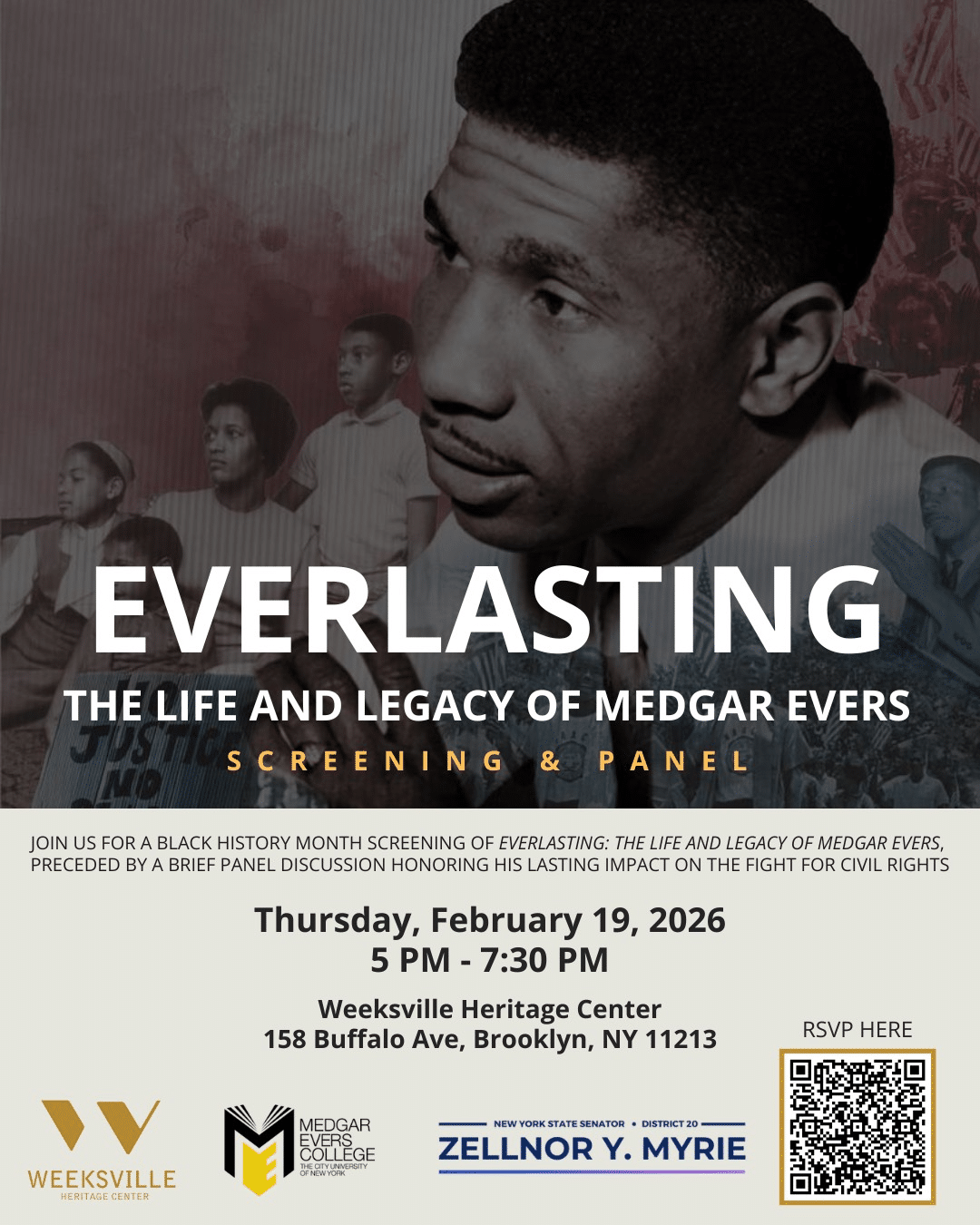 Join us on Thursday, February 19th, for a brief panel discussion and screening of "Everlasting: The Life and Legacy of Medgar Evers," celebrating the life, work, and enduring legacy of the civil rights icon.